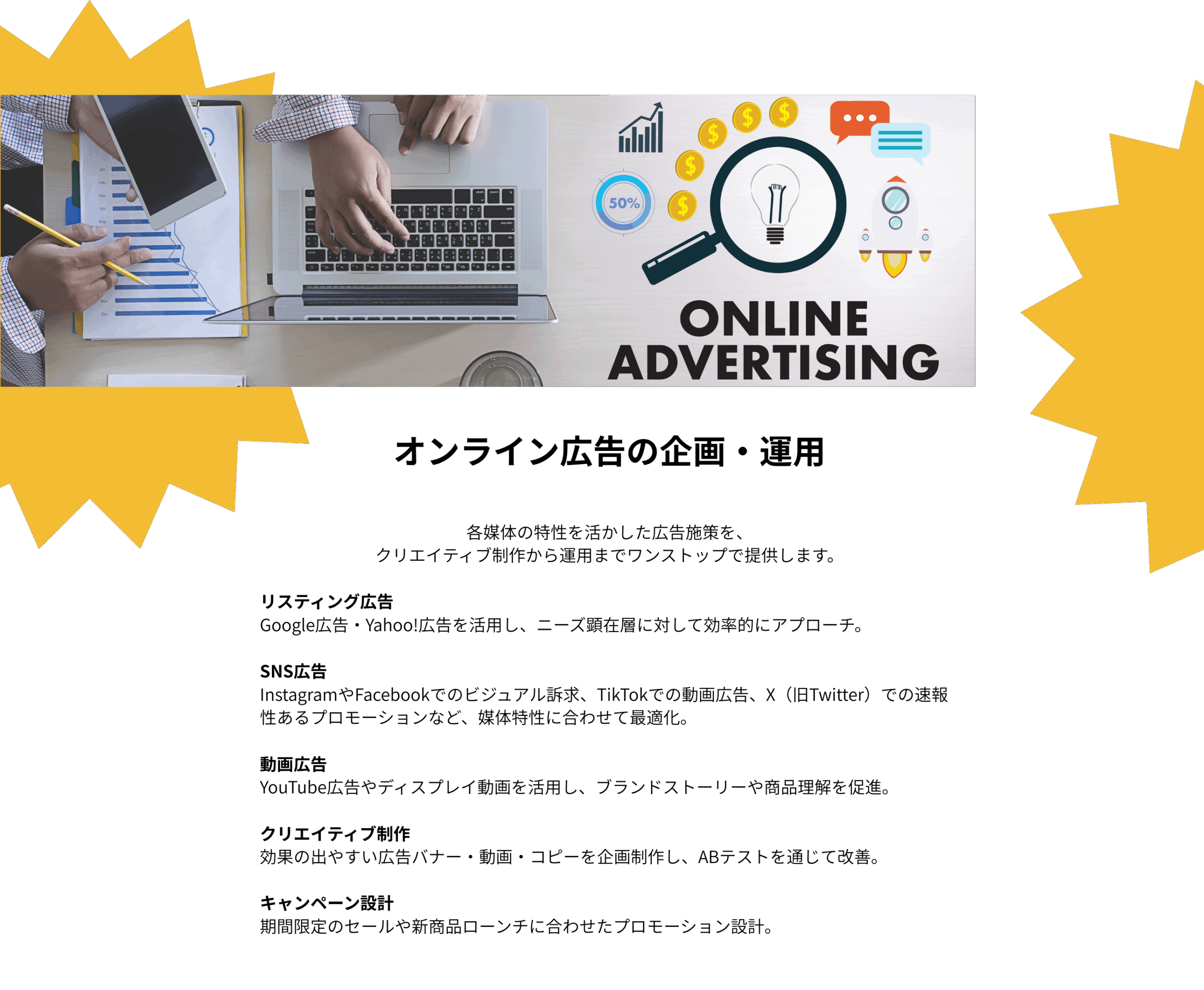 配信開始後、入札/クリエイティブ/配信面を継続調整。ABテストで学習を加速。