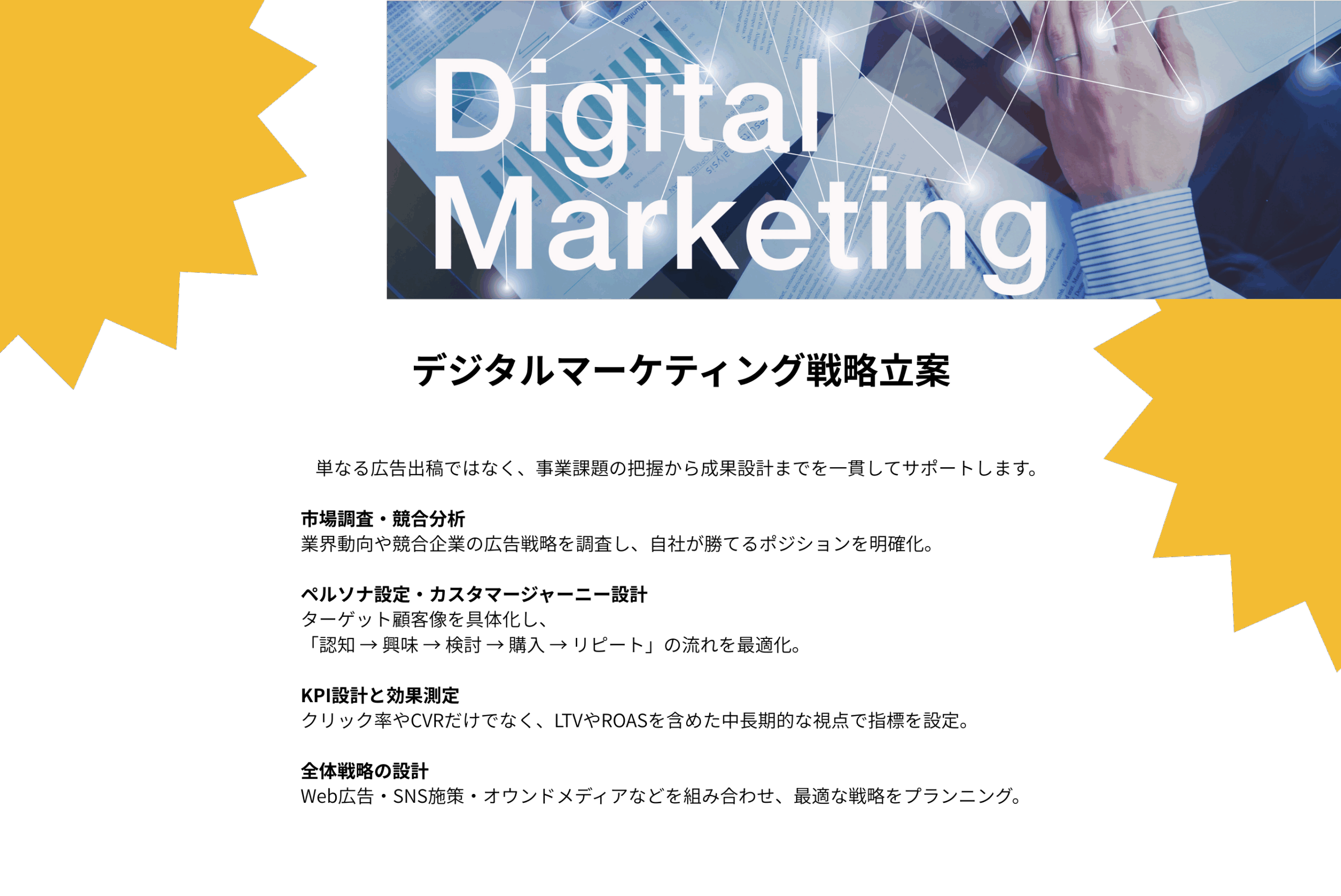市場・競合・現行施策を分析。ペルソナ/ファネル仮説とKPI案を設計します。